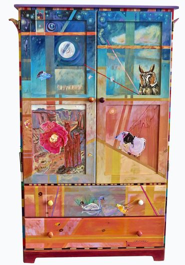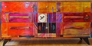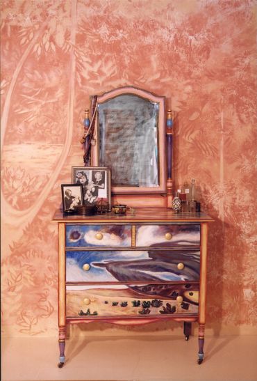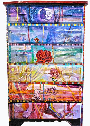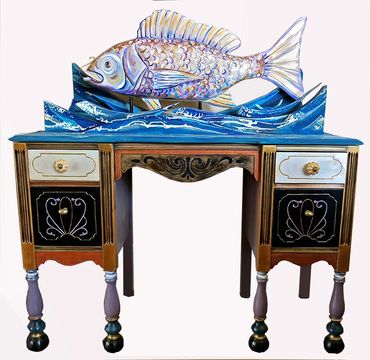 Lawrence welcomes commissions to transform clients' furniture (received ready-to-paint) and combine some of their found objects when possible. She occasionally parts with some of her own collection.